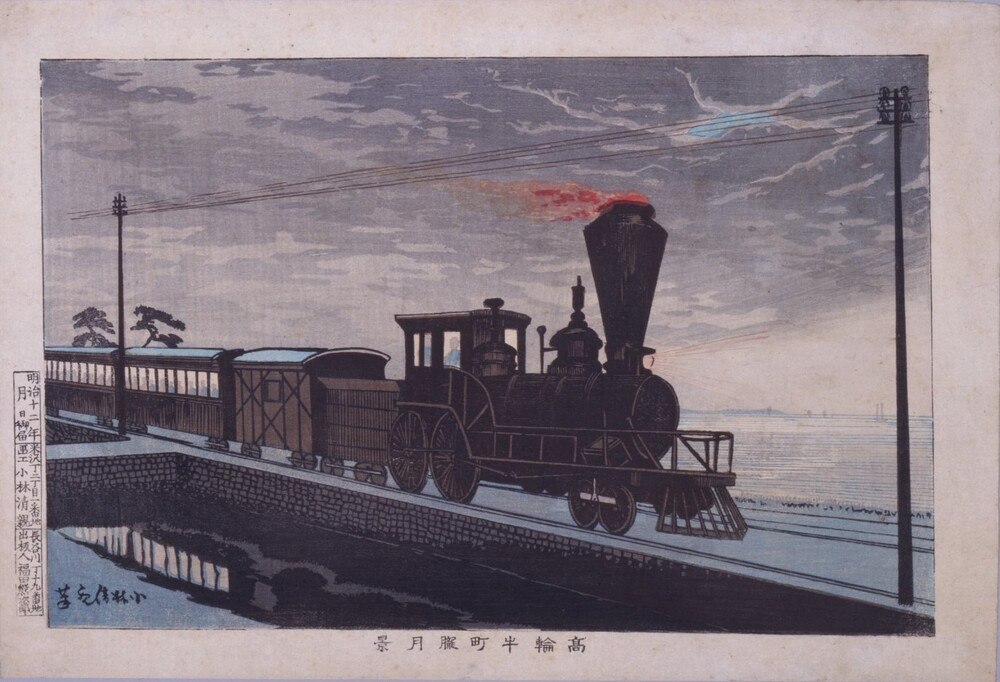 When Japan’s first railway lined opened between Shimbashi, Tokyo, and Yokohama, the steam locomotive, a great novelty, became the subject of many ukiyo-e prints. This polychrome print, which depicts the Takanawa coast between today’s JR Tamachi and Shinagawa stations in Tokyo, is one example.