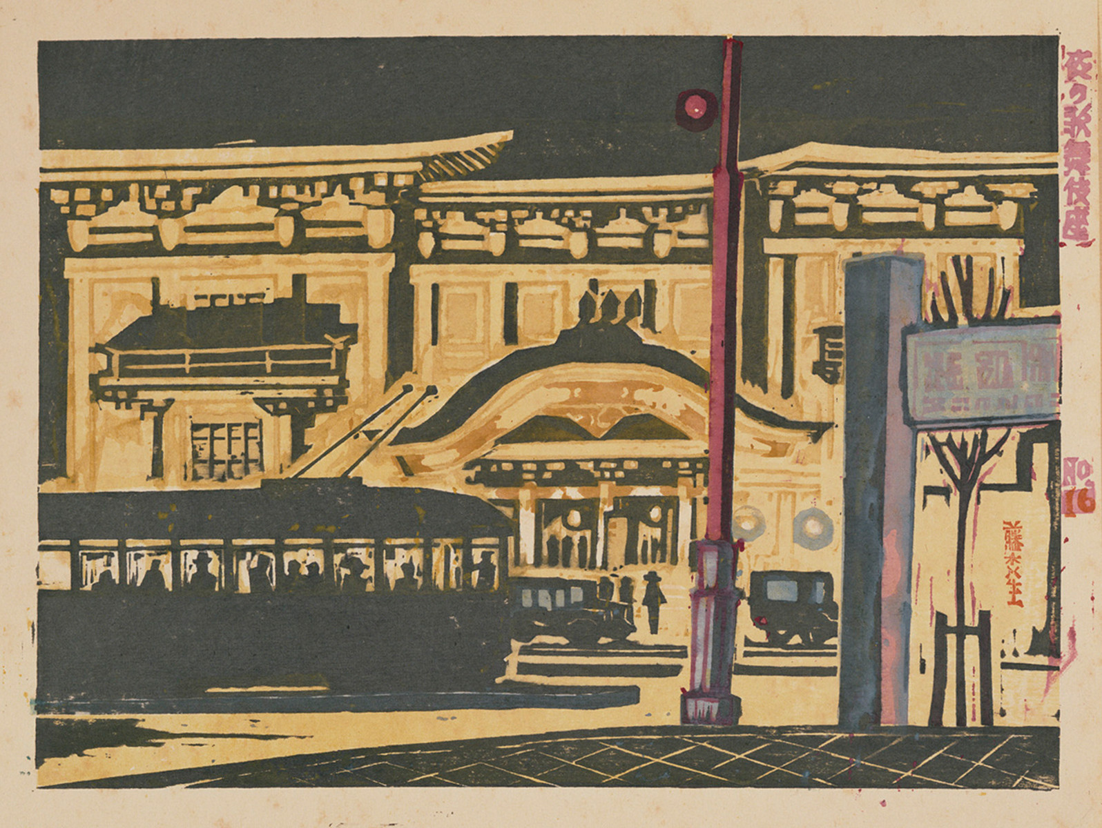 - FUJIMORI Shizuo “Night Scene at Kabukiza Theater [from "A Hundred Views of New Tokyo"]” (Museum of Contemporary Art Tokyo) Source: Tokyo Museum Collection (https://museumcollection.tokyo/en/works/6381088/)