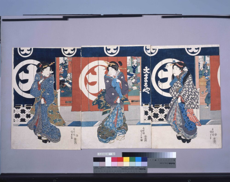- 歌川国貞(初代)/画「大丸屋前の三美人」(江戸東京博物館)出典: Tokyo Museum Collection (https://museumcollection.tokyo/works/6233253/)