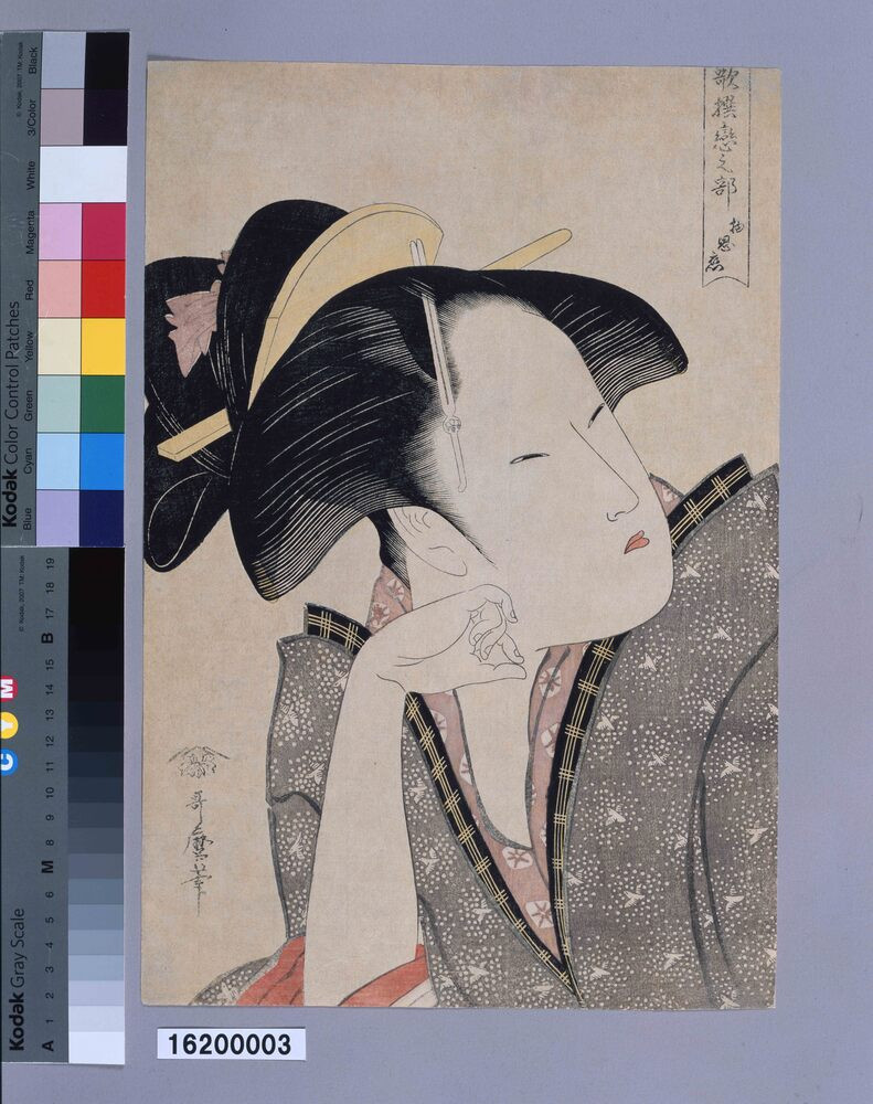 - 喜多川歌麿/画「歌撰恋之部 物思恋」(江戸東京博物館)出典: Tokyo Museum Collection (https://museumcollection.tokyo/works/6233376/)