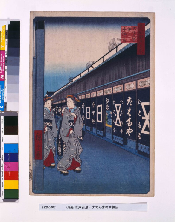 - 歌川広重(初代)/画「名所江戸百景 大てんま町木綿店」(江戸東京博物館)出典: Tokyo Museum Collection (https://museumcollection.tokyo/works/6234883/)