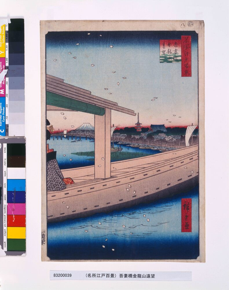 - 歌川広重(初代)/画「名所江戸百景 吾妻橋金龍山遠望」(江戸東京博物館)出典: Tokyo Museum Collection (https://museumcollection.tokyo/works/6234947/)