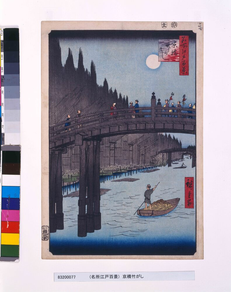 - 歌川広重(初代)/画「名所江戸百景 京橋竹がし」(江戸東京博物館)出典: Tokyo Museum Collection (https://museumcollection.tokyo/works/6235005/)