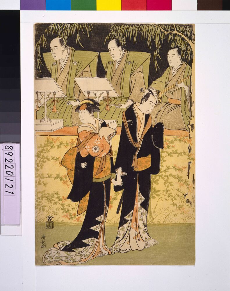 - 鳥居清長/画「出語り 三代目沢村宗十郎の治兵衛と四代目岩井半四郎の小春」(江戸東京博物館)出典: Tokyo Museum Collection (https://museumcollection.tokyo/works/6239207/)