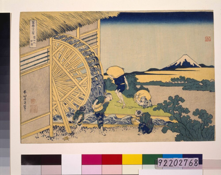 - 葛飾北斎/画「冨嶽三十六景 隠田の水車」(江戸東京博物館)出典: Tokyo Museum Collection (https://museumcollection.tokyo/works/6249440/)