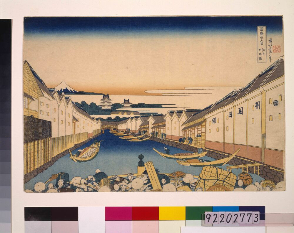 - 葛飾北斎/画「冨嶽三十六景 江戸日本橋」(江戸東京博物館)出典: Tokyo Museum Collection (https://museumcollection.tokyo/works/6249455/)