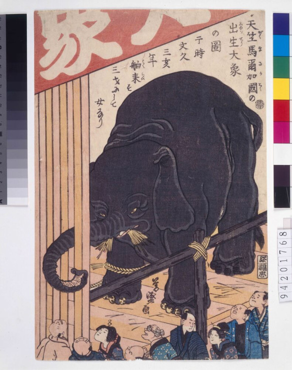 - 歌川芳盛/画「天竺馬爾加国の出生大象の図」(江戸東京博物館)出典: Tokyo Museum Collection (https://museumcollection.tokyo/works/6252253/)