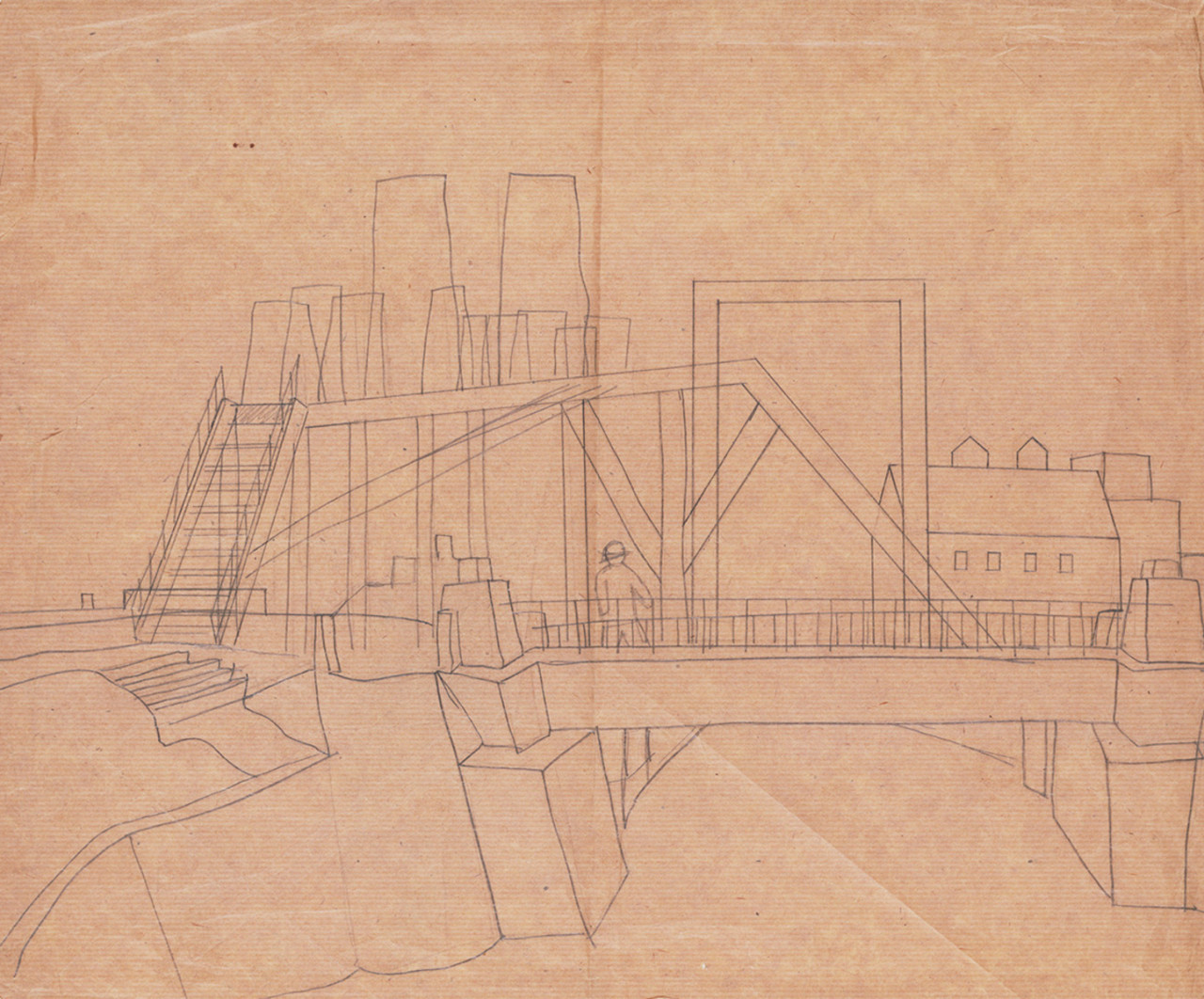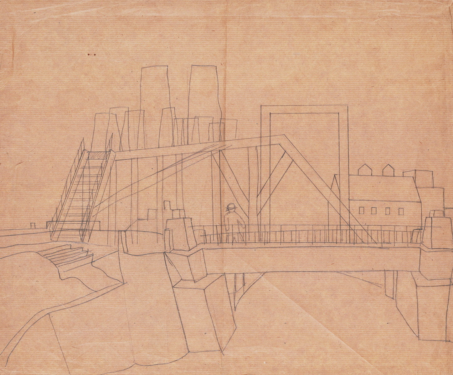 松本竣介は戦中戦後の苛酷な時代状況のもとで生き、活動した画家として知られる。病気で聴覚を失ったこともあり画家を志すようになった彼は、少年時代を過ごした岩手から17歳で上京したのち、36歳の若さで急逝するまで、静謐な抒情性をもつ都市風景を中心に独自の絵画を探究した。また竣介は当時の国家による文化統制に異義をとなえ、自画像や人物構想画にたくして芸術の自由な創造性と人間の自立性を訴えたことから、のちの時代に「抵抗の画家」と呼ばれた。当館収蔵の素描約60点には、《ニコライ堂》、《鉄橋近く》、《Y市の橋》などの、1941年頃から集中して描かれた東京・横浜近辺の風景が多数含まれており、竣介の織密な制作プロセスを知る手がかりともなっている。1点の完成作品を得るために、彼は現場での多数のスケッチを基に、アトリエでさらに素描をまとめ直し、油彩画や素描作品のためのカルトン(原寸大下絵)を制作した。ハトロン紙に描かれた下絵は、輪郭線をカンヴァスや画用紙に正確に転写し、ねらい通りの画面構成をつくり出すためのものである。こうした準備段階で竣介は、ある風景を別の場所や人物モティーフと組み合わせ、大きさや形を変えるなど現実を自由に再構成し、次第に線を強く明確なものに仕上げていった。戦局悪化のなかで竣介は東京にとどまりひたすら目前の風景と対峙した。描かれた都市風景は、細部にいたるまで写実的でありながら、時に孤独や不安、幻想味を帯びた心象風景となった。