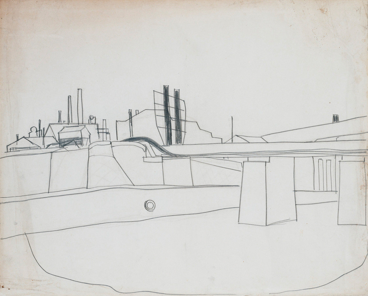 松本竣介は戦中戦後の苛酷な時代状況のもとで生き、活動した画家として知られる。病気で聴覚を失ったこともあり画家を志すようになった彼は、少年時代を過ごした岩手から17歳で上京したのち、36歳の若さで急逝するまで、静謐な抒情性をもつ都市風景を中心に独自の絵画を探究した。また竣介は当時の国家による文化統制に異義をとなえ、自画像や人物構想画にたくして芸術の自由な創造性と人間の自立性を訴えたことから、のちの時代に「抵抗の画家」と呼ばれた。当館収蔵の素描約60点には、《ニコライ堂》、《鉄橋近く》、《Y市の橋》などの、1941年頃から集中して描かれた東京・横浜近辺の風景が多数含まれており、竣介の織密な制作プロセスを知る手がかりともなっている。1点の完成作品を得るために、彼は現場での多数のスケッチを基に、アトリエでさらに素描をまとめ直し、油彩画や素描作品のためのカルトン(原寸大下絵)を制作した。ハトロン紙に描かれた下絵は、輪郭線をカンヴァスや画用紙に正確に転写し、ねらい通りの画面構成をつくり出すためのものである。こうした準備段階で竣介は、ある風景を別の場所や人物モティーフと組み合わせ、大きさや形を変えるなど現実を自由に再構成し、次第に線を強く明確なものに仕上げていった。戦局悪化のなかで竣介は東京にとどまりひたすら目前の風景と対峙した。描かれた都市風景は、細部にいたるまで写実的でありながら、時に孤独や不安、幻想味を帯びた心象風景となった。