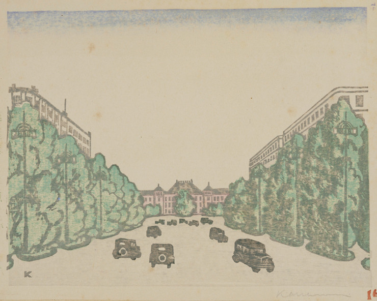 - 諏訪 兼紀「行幸道路[『新東京百景』より]」(東京都現代美術館)出典: Tokyo Museum Collection (https://museumcollection.tokyo/works/6381059/)