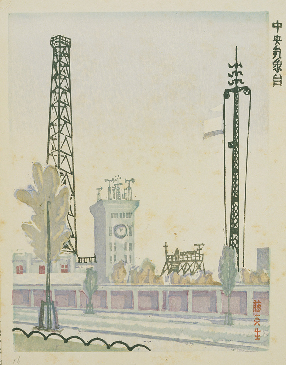 - 藤森 静雄「中央気象台[『新東京百景』より]」(東京都現代美術館)出典: Tokyo Museum Collection (https://museumcollection.tokyo/works/6381068/)
