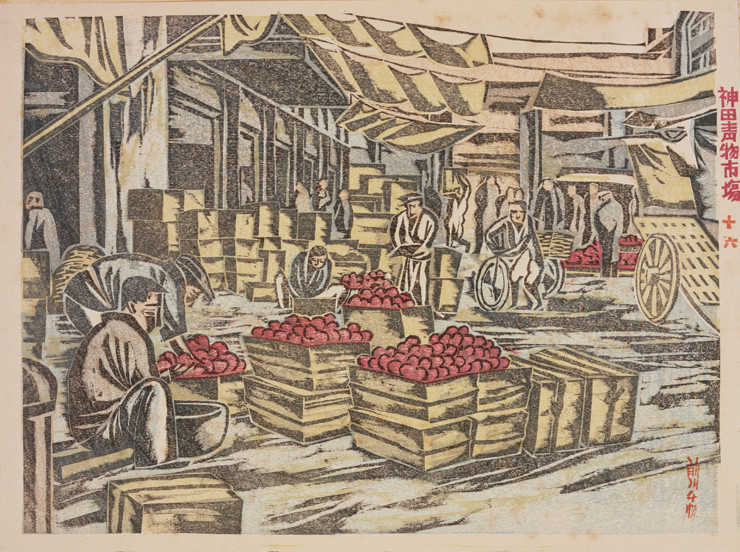 - 前川 千帆「神田青物市場[『新東京百景』より]」(東京都現代美術館)出典: Tokyo Museum Collection (https://museumcollection.tokyo/works/6381133/)