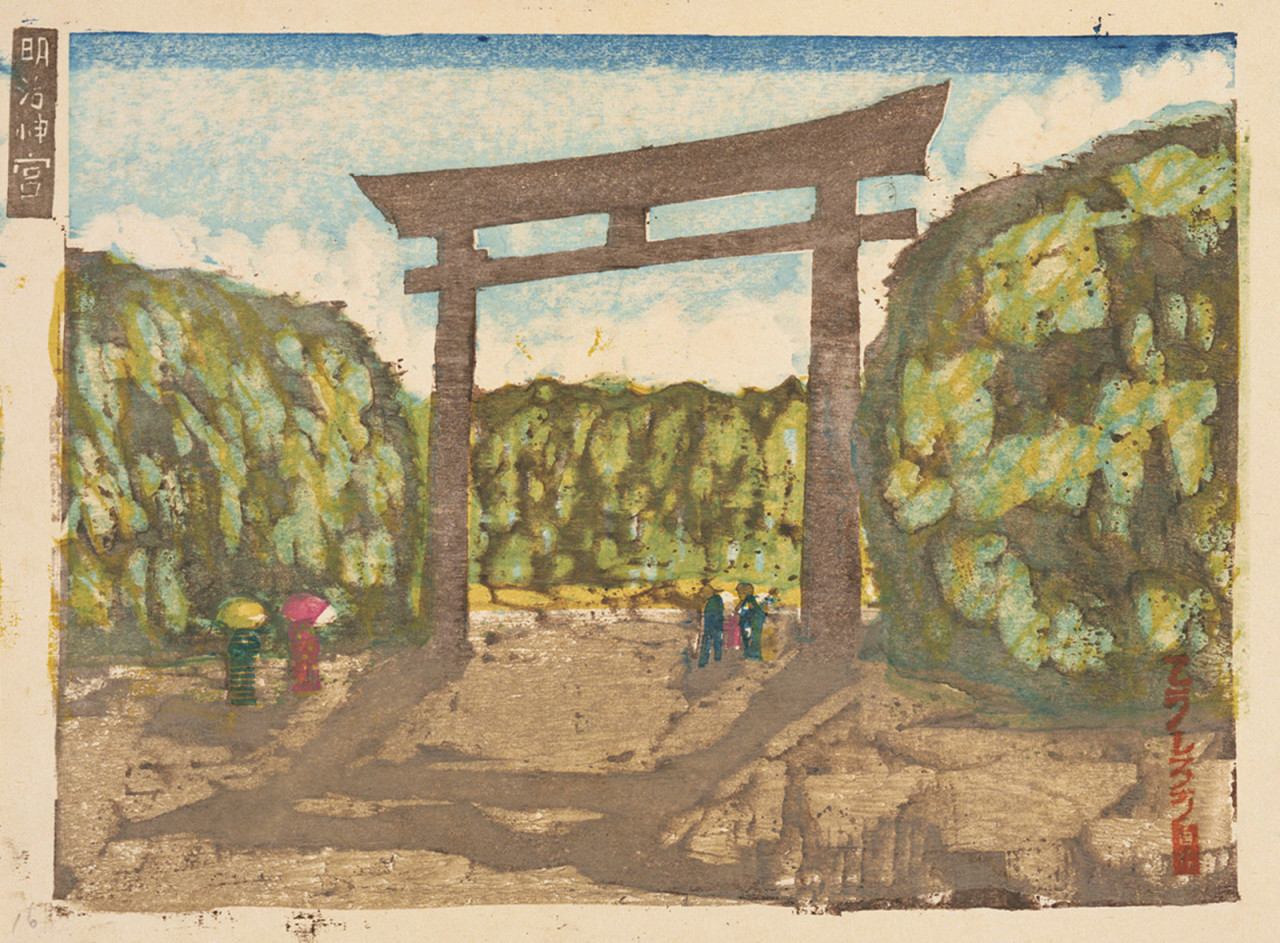 - 恩地 孝四郎「明治神宮[『新東京百景』より]」(東京都現代美術館)出典: Tokyo Museum Collection (https://museumcollection.tokyo/works/6381149/)