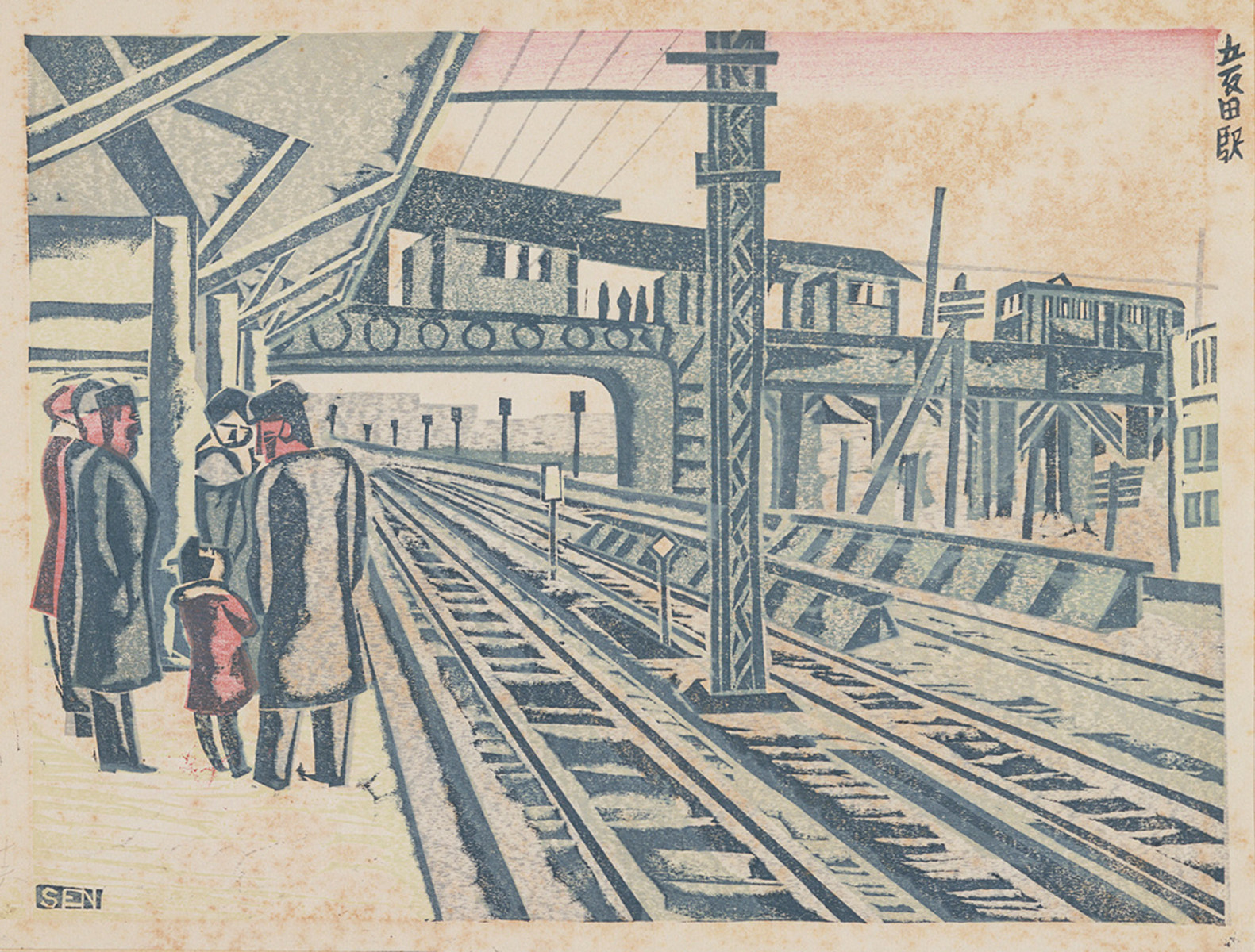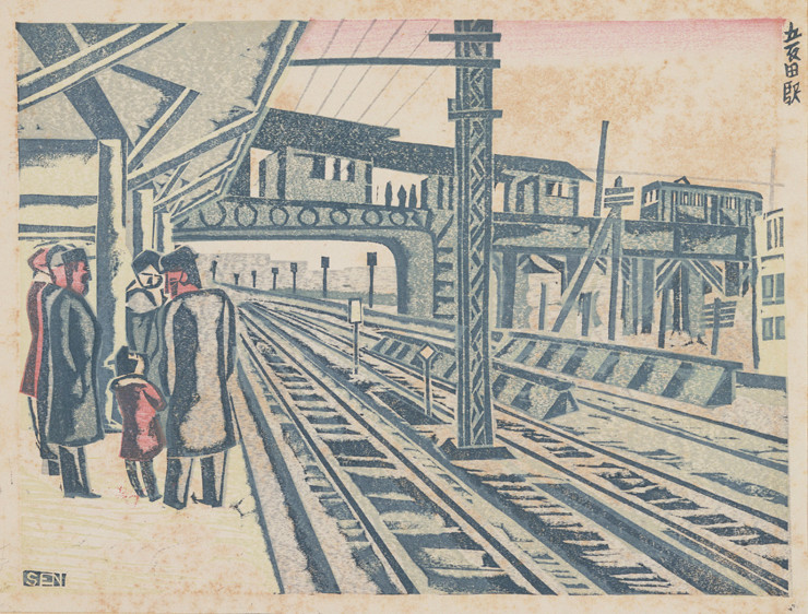 - 前川 千帆「五反田駅[『新東京百景』より]」(東京都現代美術館)出典: Tokyo Museum Collection (https://museumcollection.tokyo/works/6381156/)