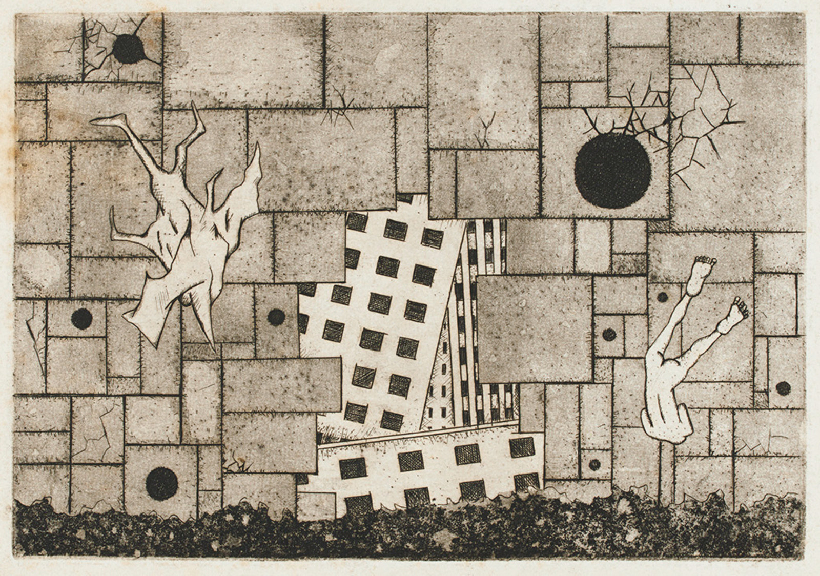 - 石井 茂雄「[崩壊する都市、落下する人体]」(東京都現代美術館)出典: Tokyo Museum Collection (https://museumcollection.tokyo/works/6381870/)