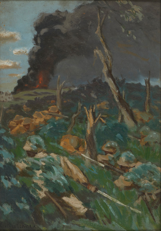- 栗原 信「シンガポール最後の日(ブキテマ高地)」(東京都現代美術館)出典: Tokyo Museum Collection (https://museumcollection.tokyo/works/6386899/)